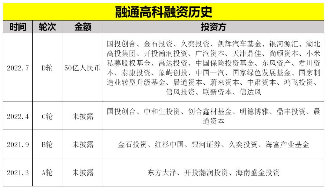 而且,融通高科今年7月完成的D輪融資,金額高達(dá)50億元。投后估值達(dá)到180億元。在這一輪融資中,除了風(fēng)險(xiǎn)投資基金外,更引人注目的是引進(jìn)了6家汽車產(chǎn)業(yè)資本:一汽、廣汽、上汽、東風(fēng)、小米、蔚來。