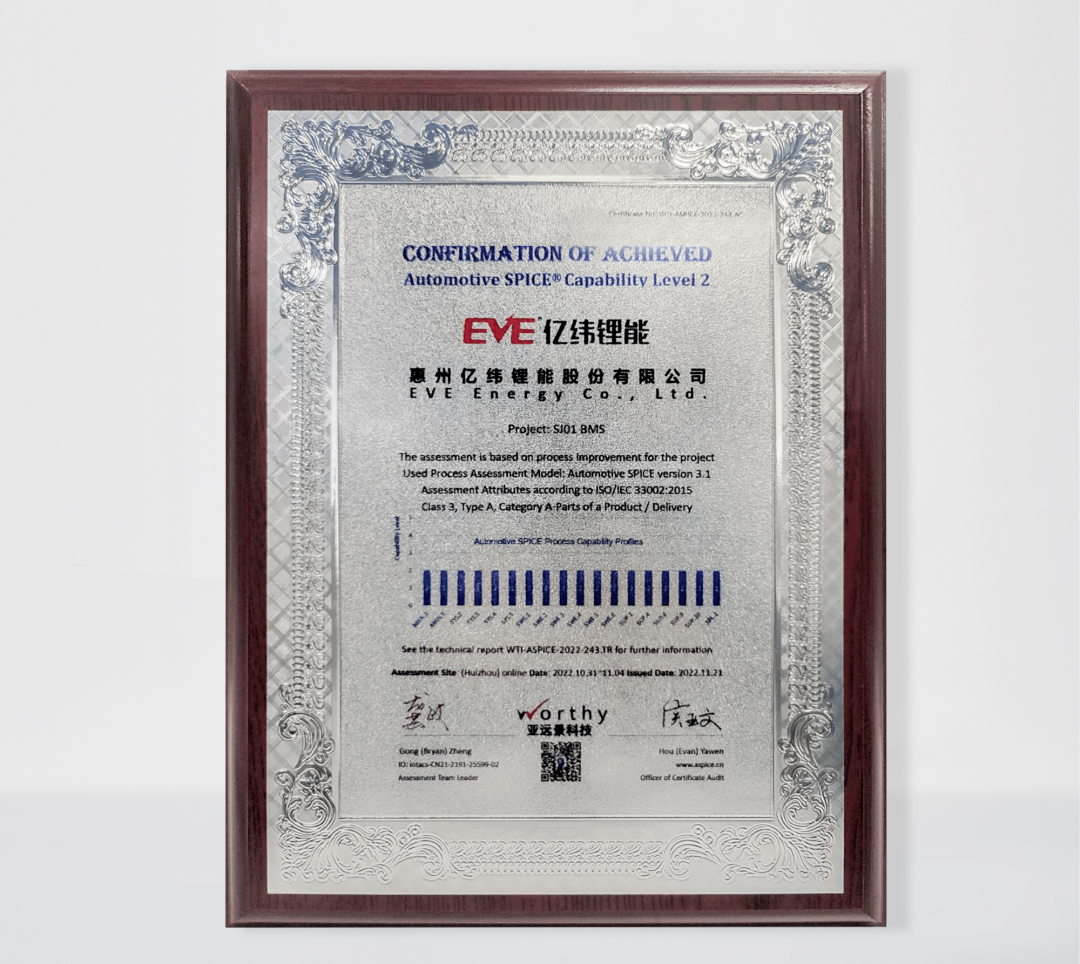 近日,惠州億緯鋰能股份有限公司(以下簡稱“公司”)SJ01 BMS項(xiàng)目通過Automotive SPICE Capability Level 2(以下簡稱“ASPICE CL2”)認(rèn)證,標(biāo)志著公司的BMS開發(fā)能力達(dá)到國際領(lǐng)先水平。
