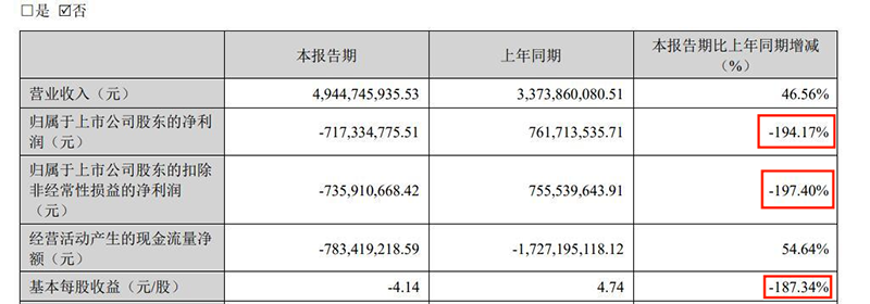 根據披露,德方納米今年一季度實現營業收入49.45億元,同比增長46.56%;歸屬于上市公司股東的凈利潤虧損7.17億元,同比下降194.17%,由盈轉虧;歸屬于上市公司股東的扣非凈利潤虧損7.36億元,同比下降197.40%,由盈轉虧;基本每股虧損4.14元,去年同期為4.74元。