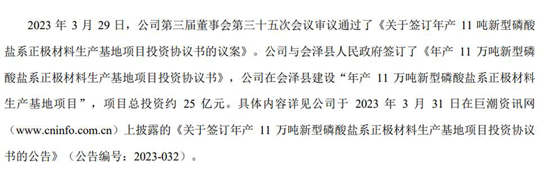 2023年3月29日,德方納米年產11萬噸新型磷酸鹽系正極材料生產基地項目正式在云南省曲靖市會澤縣簽約。該項目計劃總投資25億元。