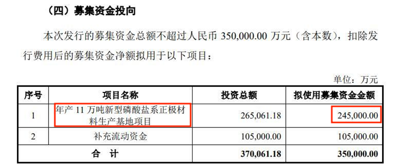 4月26日,德方納米披露可轉債募集說明書(申報稿),預計募集資金總額不超過35億元(含本數),用于“年產11萬噸新型磷酸鹽系正極材料生產基地項目”“補充流動資金”。