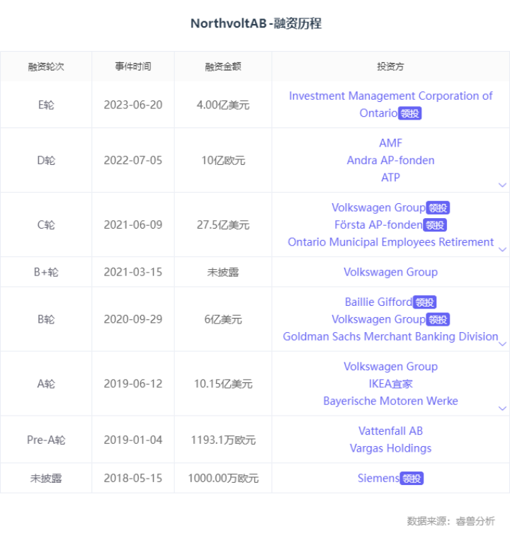 根據(jù)睿獸分析的數(shù)據(jù),除了大眾汽車連續(xù)投了4輪之外(至少2輪領(lǐng)投),Northvolt還獲得了高盛、Baillie Gifford、宜家、ABB、西門子,以及類似于歐洲多個(gè)養(yǎng)老基金的投資(ATP、AMF等)。