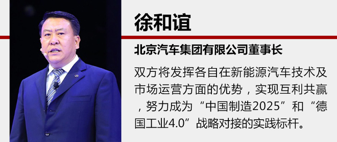 徐和誼表示:“作為中德兩國汽車企業的代表,北汽集團與戴姆勒集團多年來攜手前行,取得了驕人成績,此次簽約是雙方面向未來在新能源汽車領域邁出的重要一步。北汽集團是中國最早發展新能源汽車的企業之一,純電動汽車銷量連續多年領跑中國市場,已成為中國新能源汽車產業的領軍企業;戴姆勒集團在新能源汽車領域擁有長時間的探索,積累了先進的技術經驗。雙方將發揮各自在新能源汽車技術及市場運營方面的優勢,實現互利共贏,努力成為‘中國制造2025’和‘德國工業4.0’戰略對接的實踐標桿。”