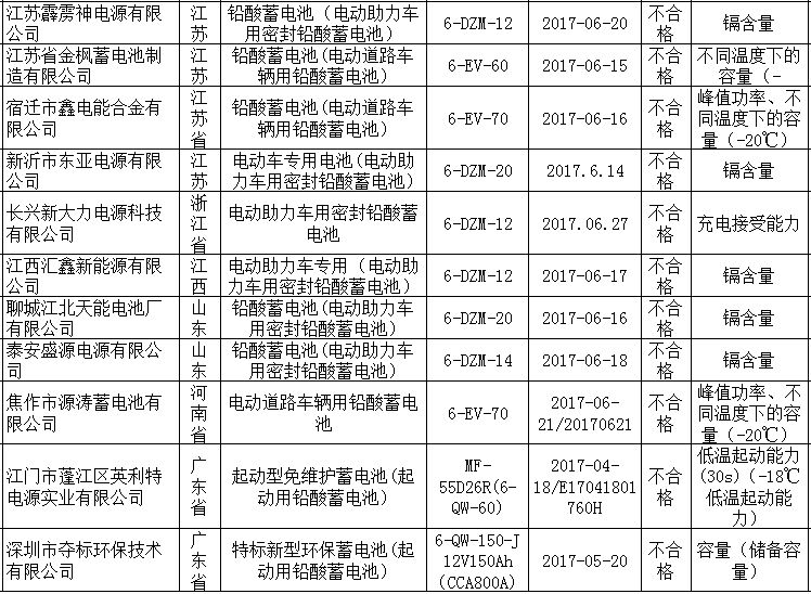 本次抽查發現鉛酸蓄電池不同單元的不合格產品存在的主要質量問題分別為:(一)起動用鉛酸蓄電池。有1個批次產品容量試驗時電池異常發熱,1個批次產品低溫起動能力差,均不符合標準的要求。(二)電動助力車用鉛酸蓄電池。有1個批次產品充電接受能力差,5個批次產品鎘含量不達標,均不符合標準的要求。(三)電動道路車輛用鉛酸蓄電池。有3個批次產品低溫容量低,2個批次產品峰值功率不足,均不符合標準的要求。
