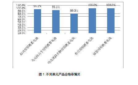 從抽查產品單元上來看,抽查起動用鉛酸蓄電池53批次,合格51批次,合格率96.2%;抽查電動助力車用鉛酸蓄電池87批次,合格81批次,合格率93.1%;抽查電動道路車輛用鉛酸蓄電池15批次,合格12批次,合格率80%;抽查牽引用鉛酸蓄電池樣品16批次,合格16批次;抽查儲能用鉛酸蓄電池樣品12批次,合格12批次。不同單元產品合格率情況見下圖: