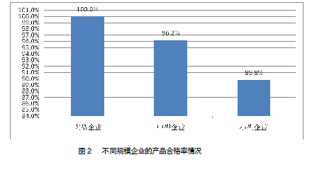 從抽查的企業規模上來看,大型企業抽查43家企業的43批次產品,有43家企業的43批次產品合格,產品合格率100%;中型企業抽查到52家企業的52批次產品,有50家企業的50批次產品合格,產品合格率為96.2%;小型企業抽查到88家企業的88批次產品,有79家企業的79批次產品合格,產品合格率為89.8%。不同規模企業的產品合格率情況見下圖: