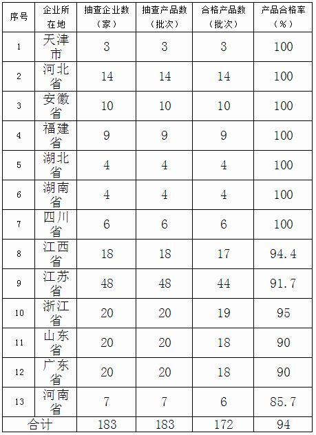 本次抽查覆蓋了江蘇、浙江、安徽等13個省(區、市)183家企業的183批次產品(不涉及出口產品),經檢驗,172家企業的172批次產品合格,11家企業的11批次產品不合格,產品合格率為94%,不合格產品檢出率為6%。