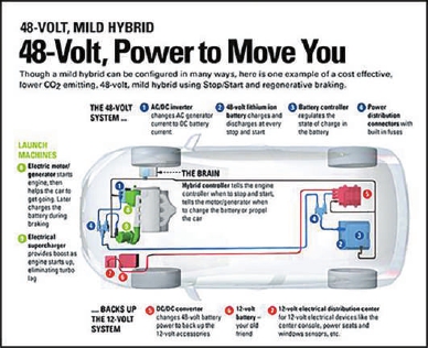 48V系統是指電壓為48伏,以能量小于1度電的功率型鋰離子電池替代傳統的鉛酸電池,用BSG電機替代傳統的啟動電機和發電機,除具備自動啟停功能外,還能在必要時提供輔助動力的輕混系統。