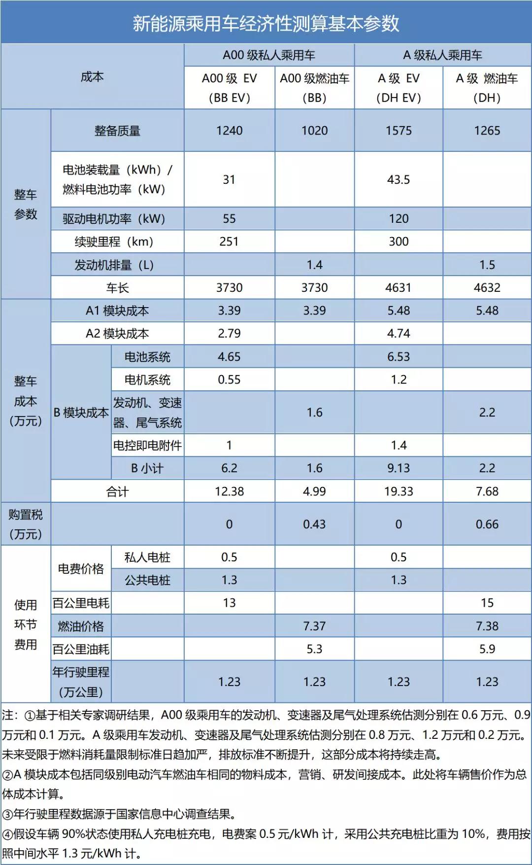 他們對乘用車中占比較大的A00級車和A級車進(jìn)行經(jīng)濟(jì)性分析,將動力系統(tǒng)不同部分定位為B模塊成本;B模塊之外正常物料成本,營銷、研發(fā)間接成本攤銷,定義為A1模塊成本;尚未達(dá)到新能源汽車量產(chǎn),產(chǎn)生的額外費用定義A2模塊成本,將同級別電動汽車與燃油車進(jìn)行了對比。