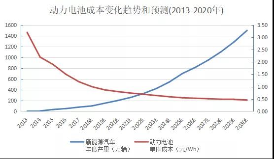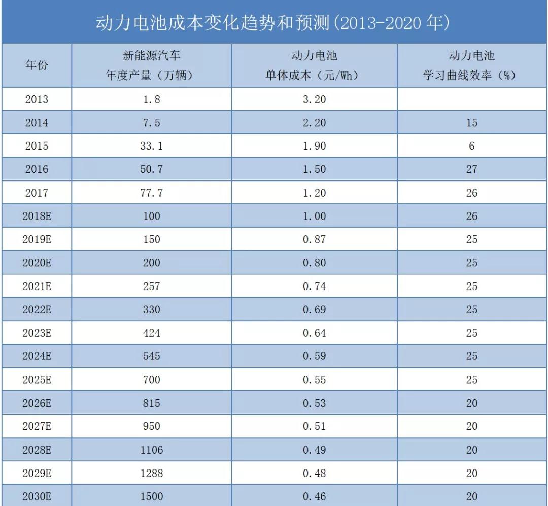 技術(shù)進(jìn)步對于成本下降的作用也十分明顯。動力電池產(chǎn)業(yè)近年來學(xué)習(xí)效率為25%-20%,因此,預(yù)計2020年、2027年內(nèi)和2030年動力電池成本將分別降至0.8元/Wh、0.51元/Wh和0.46元/Wh。