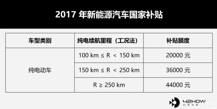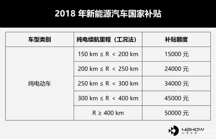 2018 年相較于 2017 年,純電動車型的補貼門檻由 100 km 上漲到了 150 km,并且將 2017 年補貼標準中的 ≥ 250 km 一個標準細分成了 250 到 300,300 到 400 和 ≥ 400 km。