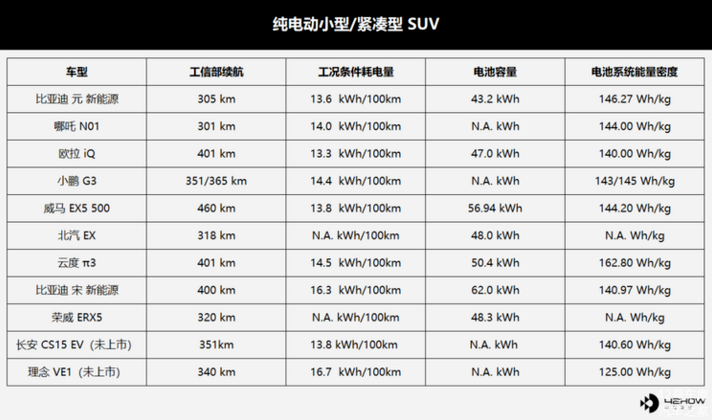 近些年國內(nèi)高速增長的 SUV 市場使得純電動小型和緊湊型 SUV 成為了最為火爆的新能源戰(zhàn)場。除了傳統(tǒng)車企在此布置多款產(chǎn)品外,造車新勢力們也很喜歡在此“扎堆”,小鵬、哪吒、威馬的首款產(chǎn)品均在此范疇。這一級別的電池系統(tǒng)能量密度基本都在 140Wh/kg 以上,只有還未上市的合資自主品牌產(chǎn)品——廣本理念 VE1 落在后頭。