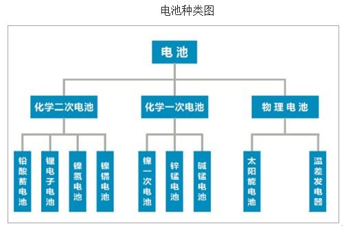 一般來說,電池包括物理電池和化學電池。物理電池是利用物理效應,將太陽能、熱能或核能直接轉換成直流電能的裝置,如太陽能電池、溫差發電器、核電池等;化學電池是一種將化學能直接轉變成直流電能的裝置,如鉛酸蓄電池、鋰離子電池、鋅錳電池等。在電池中,化學電池是最主要的電池。化學電池按是否可以循環使用,分為一次電池和二次電池兩大類。其中,一次電池是活性物質僅能使用一次的電池,又稱原電池,如鋅錳電池,堿錳電池等;二次電池可充電、循環使用,又稱蓄電池。蓄電池利用電池內活性物質在放電狀態下發生化學反應輸出電流,在充電狀態下發生逆向化學反應儲存電能。