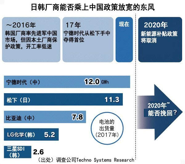 韓國企業也將再次轉為投資攻勢。LG化學計劃2020年之前在南京新建工廠,預計產能為可滿足50萬輛純電動汽車的需求。還計劃與中國華友鈷業成立合資公司,生產電池的主要零部件正極材料。三星SDI正在討論在江蘇省無錫市新建車載電池工廠。
