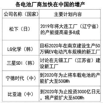 此前,全球最大的車載電池制造商寧德時代新能源科技(CATL)計劃2020年之前將車載電池的產能提高至2017年的4倍以上,達到50GWh。比亞迪(BYD)將在2020年之前投入超過3000億日元,將年產能提高至60GWh。而日本的松下最早將在2019年內將車載電池的產能最大提高8成。韓國的LG化學也將于2020年在南京新建工廠。
