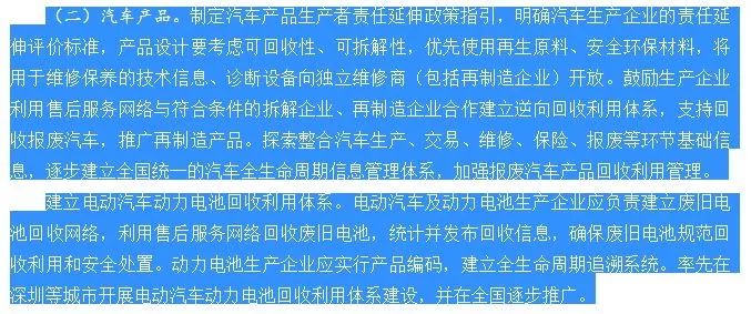 2017年,國務院發布99號文《生產者責任延伸制度推行方案》,涉及新能源汽車生產責任延伸制度,要求建立動力電池回收利用體系,確保廢舊電池規范回收利用和安全處置。