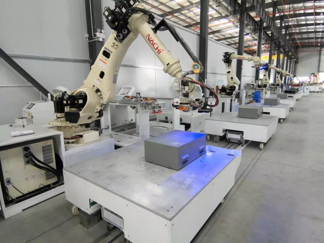 動力電池系統在車輛拆解車間被拆下后,送到動力電池系統拆解車間。系統拆解線通過機器人自動擰開上蓋等操作,將系統拆成模組,模組拆成電芯。