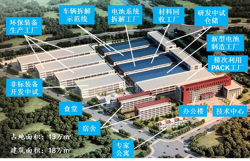 按照規劃乾泰將建設一個占地13萬平方米的產業園,目前已經建起的,有車輛拆解示范工廠、電池系統拆解工廠、材料回收工廠、梯次利用PACK工廠四條產線,和一些附屬建筑。