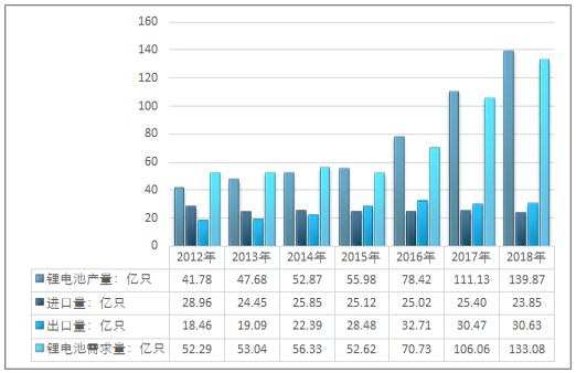 根據國家統計局數據,2018年我國鋰電池行業產量139.87億只,2018年1-11月鋰電池進口量21.86億只,出口28.08億只,測算2018年國內鋰電池行業需求量達到了133.08億只。
