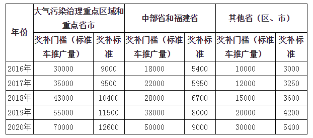 2016-2020年各地區新能源汽車充電基礎設施獎補標準(單位:輛、萬元)