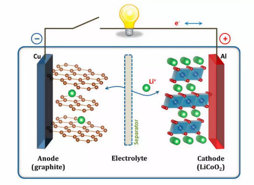 鋰離子電池是一種可反復充放電的二次電池。他的主要組成部分有:正極、負極、隔膜和電解液。如下圖所示,充電時鋰離子從正極脫出,經過電解質進入到負極,同時釋放的電子從外部電路轉移至負極,維持電荷平衡;放電時鋰離子從負極脫出,經過電解質進入正極,而電子從負極經外部電路到達正極。在每一次充放電循環過程中,鋰離子(Li+)充當了電能的搬運載體,周而復始的從正極→負極→正極來回的移動,與正、負極材料發生反應,將化學能和電能相互轉換,實現了電荷的轉移,這就是鋰離子電池的基本原理。