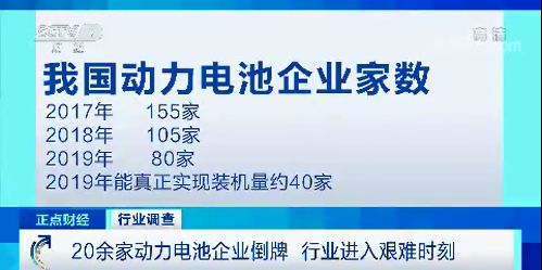 數據顯示,2017年,我國動力電池企業共有155家;2018年,這一數字下滑到了105家;到了今年,就只剩下80家動力電池生產企業,其中能真正實現裝機量的僅40家左右。