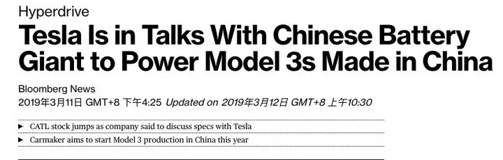 2019年3月,彭博社發表文章稱特斯拉正在與國內動力電池巨頭寧德時代進行談判,計劃采購寧德時代的電池用于上海產的、大家買的起的國產Model3。