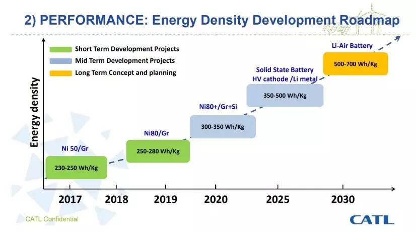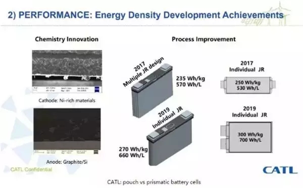 另一張圖片標有CATL文字的PPT截圖則顯示CATL的電芯能量密度將從2019年的250-280wh/kg大幅度增加到2020年的300-350wh/kg。