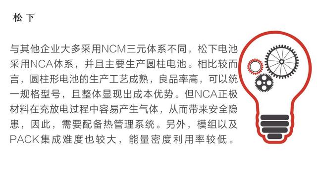 當下,松下已開發出鎳鈷錳酸鋰、鎳鈷鋁酸鋰等鋰電池,并已為企業配套。在產品開發中,為了解決鎳氧化物帶來的熱穩定性低和安全方面的問題,松下在正極材料表面進行了納米涂層處理,特別注重通過“松下固溶液Panasonic Solid Solution(PSS)”等技術提高安全性。