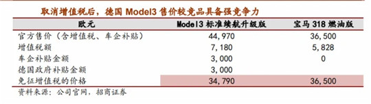 以德國購買純電版高爾夫為例,官方指導價為3.19萬歐元的純電高爾夫,在減去6000歐元國家補助后,包含購置稅到手價是2.59萬歐元。但如果免除19%的購置稅,到手價格降到2.08萬歐元。同樣的,特斯拉Model 3也直接從4.5萬歐元降到3.48萬歐元,大大刺激消費欲望。