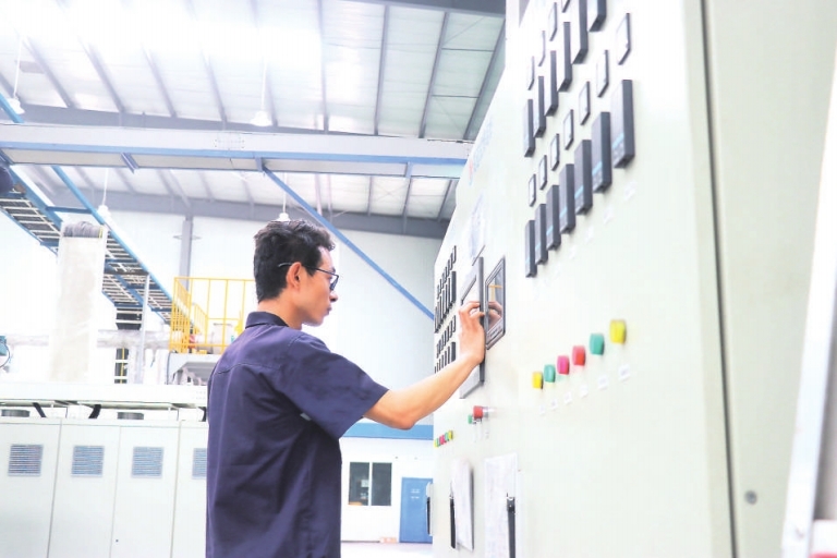 鋰電及新材料企業朗晟科技生產車間工人在操作儀器。