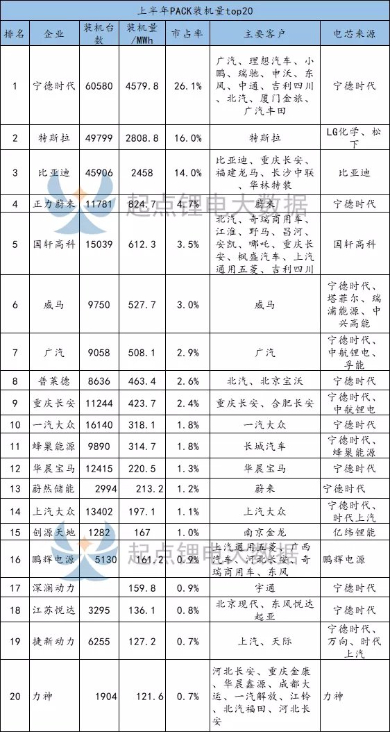 電池PACK企業(yè)實(shí)現(xiàn)裝機(jī)配套,寧德時(shí)代、特斯拉、比亞迪、正力蔚來(lái)、國(guó)軒高科為T(mén)OP 5。