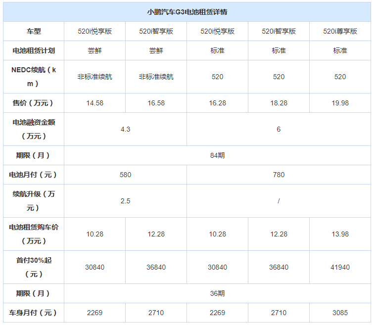 由于規格不同,因此小鵬汽車的電池租賃方案會因車型的不同而有所差異,例如小鵬汽車G3520i車型的電池容量為66.5kWh,電池定價60000元;而P7車型的電池容量為80.9kWh,電池定價75000元。消費者購買完裸車后,即可按月租用電池,租金因車型不同而有所差異,費用低至580元/月,當車主租用84期(7年)后,該電池則歸消費者所有。