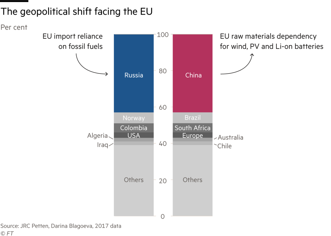 歐盟所面臨的地理政治轉型。藍色:歐洲化石燃料進口依賴俄羅斯;紅色:歐洲在風能、太陽能光伏和鋰電池的原材料方面依賴中國。
