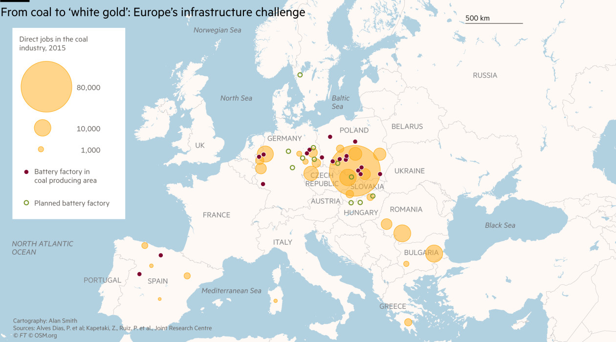 從煤炭到“白色黃金”:歐洲的基建挑戰。橙色圓圈:2015年煤礦產業的直接工作崗位;紫色圓點:煤炭生產區域的電池工廠;綠色圓圈:計劃建造的電池工廠。