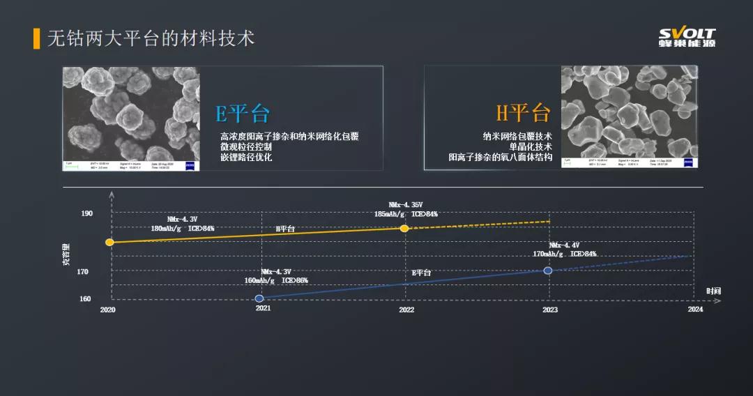 E平臺和H平臺所誕生的無鈷電芯在材料技術上有所不同。其中E平臺電芯材料主要采用高濃度陽離子摻雜和納米網絡化包覆、微觀粒徑控制、嵌鋰路徑優化,2021年容量做到160mAh/g,2023年能提升至170mAh/g;H平臺電芯材料則主要采用納米網絡包覆技術、單晶化技術、陽離子摻雜的氧八面結構,2020年容量做到180mAh/g,2022年能提升至185mAh/g。