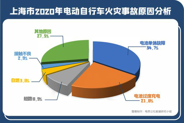 從相關部門給出的上海市381起電動車火災原因的分析來看,電動自行車蓄電池質量不過關是最重要的原因,僅電池單體故障引發的火災事故就占據了34.7%。