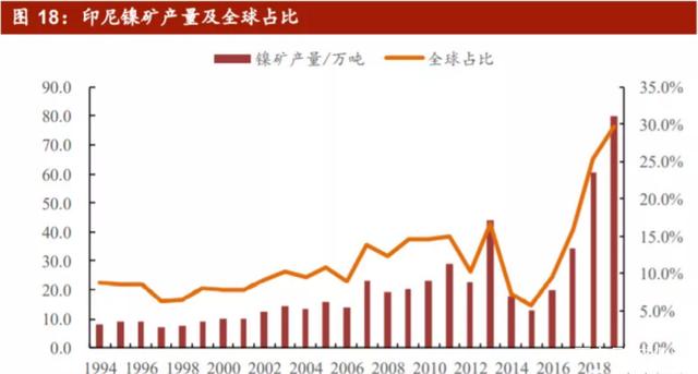 初期,硫化鎳礦產量占全球的主導地位,紅土鎳礦的供給數量較少,但隨著2007 年以后工業中發明了使用鎳鐵替代電解鎳生產不銹鋼的工藝,開采成本低的紅土鎳礦應用隨之興起,2019 年紅土鎳礦產量占比擴大至64%,且仍在提升,硫化鎳礦占比縮小至了36%。