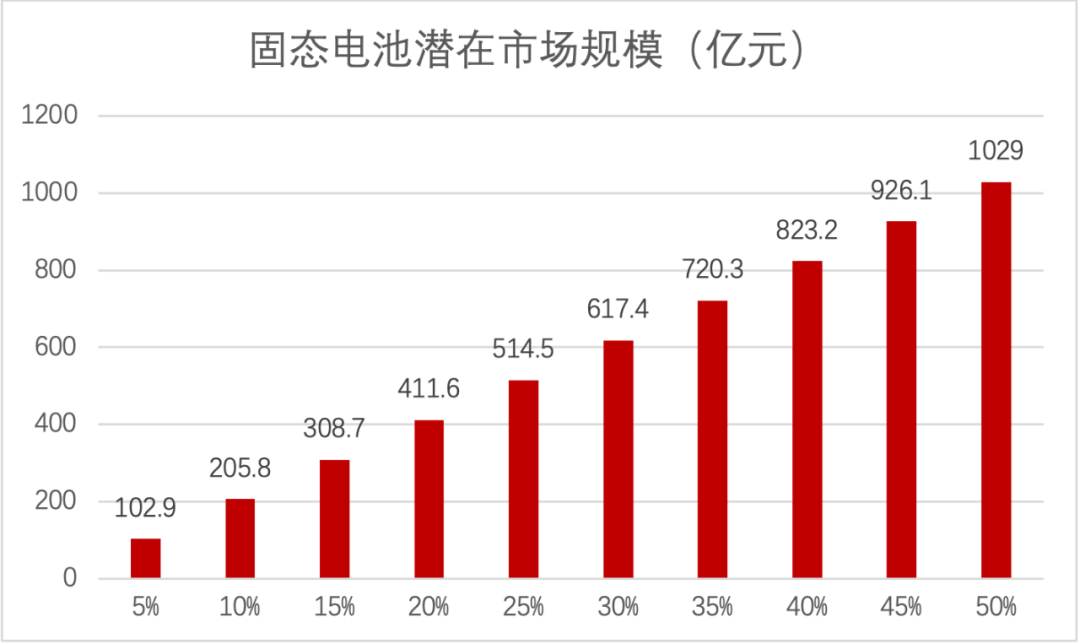 由于固態(tài)電池當(dāng)前還處于實(shí)驗(yàn)室階段,尚未有企業(yè)完成商業(yè)化量產(chǎn),因此市場(chǎng)暫未大范圍應(yīng)用固態(tài)電池。因?yàn)楣虘B(tài)電池和現(xiàn)有液態(tài)電池存在替換關(guān)系,我們將根據(jù)鋰電池現(xiàn)有市場(chǎng)規(guī)模估算固態(tài)電池潛在的市場(chǎng)規(guī)模。根據(jù)中國(guó)電子信息產(chǎn)業(yè)發(fā)展研究院的數(shù)據(jù),2019年中國(guó)鋰電池產(chǎn)業(yè)規(guī)模為2058億元。假設(shè)未來(lái)固態(tài)電池滲透率分別為:5%、10%、15%、20%、25%、30%、35%、40%、45%、50%,根據(jù)高禾投資研究中心估算,固態(tài)電池市場(chǎng)規(guī)?梢苑謩e達(dá)到:102.9、205.8、308.7、411.6、514.5、617.4、720.3、823.2、926.1、1029億元。