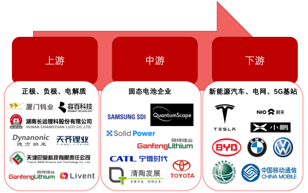 固態(tài)電池產(chǎn)業(yè)鏈主要由正極、負(fù)極和電解質(zhì)構(gòu)成。固態(tài)電池產(chǎn)業(yè)鏈與液態(tài)鋰電池大致相似,兩者主要的區(qū)別在于上游的負(fù)極材料和電解質(zhì)不同,在正極方面幾乎一致。