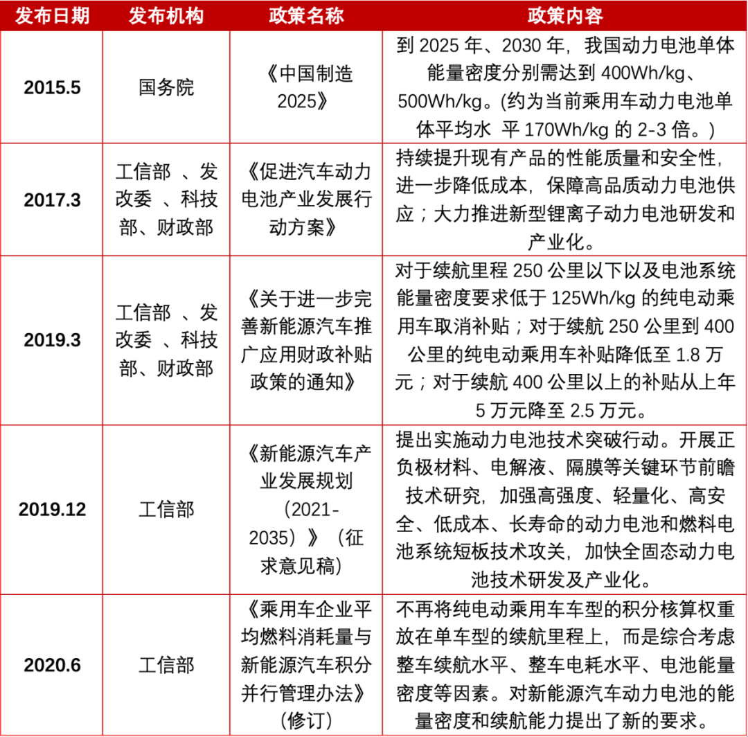 我國(guó)直接針對(duì)固態(tài)電池行業(yè)的相關(guān)政策較少,對(duì)固態(tài)電池行業(yè)影響較大的政策主要圍繞“推動(dòng)鋰電池行業(yè)的發(fā)展”以及“促進(jìn)新能源汽車動(dòng)力電池升級(jí)”這兩方面展開(kāi)。相關(guān)政策通過(guò)制定產(chǎn)業(yè)規(guī)劃、規(guī)范行業(yè)標(biāo)準(zhǔn)、修改補(bǔ)貼制度等方式,間接地對(duì)固態(tài)電池行業(yè)施加影響。