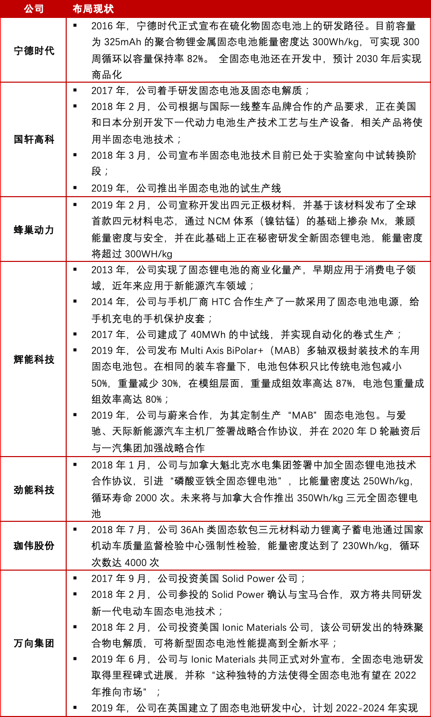 在固態(tài)電池研究方面,國(guó)內(nèi)企業(yè)不及日本、德國(guó)、美國(guó)等起步早,但越來(lái)越多的企業(yè)已經(jīng)參與其中。參與主體包括中科院化學(xué)所、中科院青島能源所、中科院寧波材料所等研究機(jī)構(gòu),贛鋒鋰業(yè)、寧德時(shí)代等電池企業(yè);更有其他領(lǐng)域企業(yè)看好固體電池跨界投資,如以汽車零部件為主的萬(wàn)向集團(tuán)、新能源汽車比亞迪等。