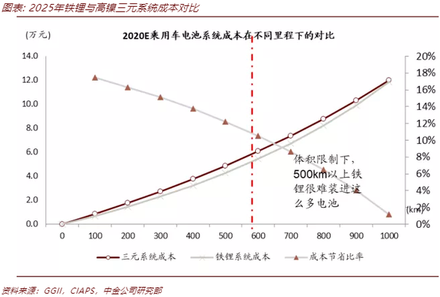 當前時點,鐵鋰在中低里程上具備顯著的成本優勢,但體積能量密度限制其普及應用于500km以上車型中。
