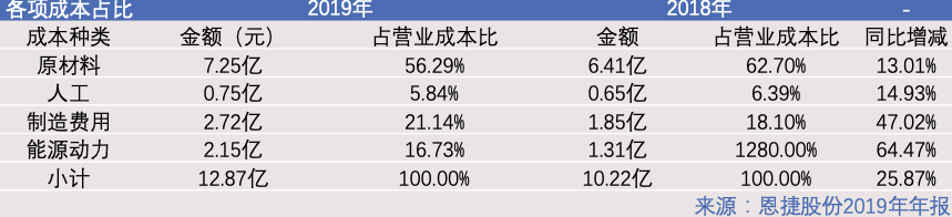 上方圖表中我們可以看到,受益于規模效應,原材料和人工雖然在2019年在絕對數量上增長了13.01%和14.93%,但是所占營業成本比卻雙雙下降。與之同時,能源動力的成本也因為生產的擴張急速上升,同比增長64.47%。
