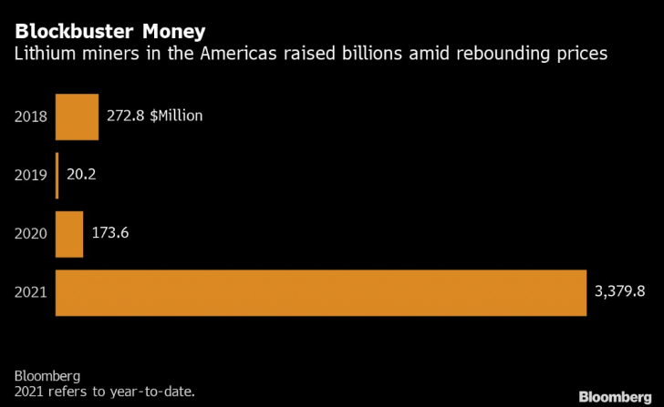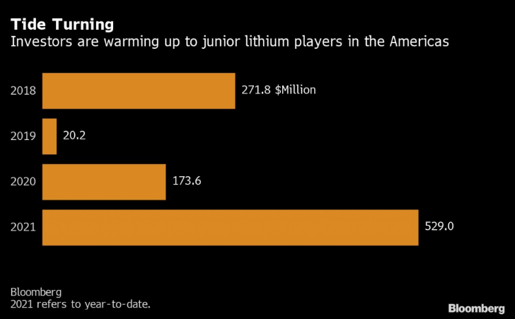 彭博社數(shù)據(jù)顯示,初級(jí)鋰礦商今年籌資5.29億美元。這比2018年至2020年的融資總額多出約6300萬(wàn)美元。