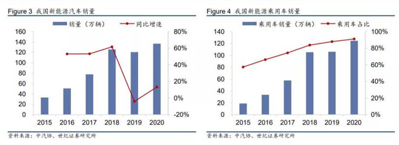 自2020年初起受到新冠疫情影響,新能源汽車市場延續了此前低迷的狀態,下半年疫情趨于穩定,經濟復蘇,汽車行業回暖,新能源汽車銷量7月開始重新實現同比正增長,市場化驅動力量顯現。2020年,新能源汽車生產完成136.6萬輛,同比增長10%,銷售完成136.7萬輛,同比增長11%。其中12月新能源汽車產銷分別完成23.5萬輛和24.8萬輛,同比分別增長57.4%和51.7%。