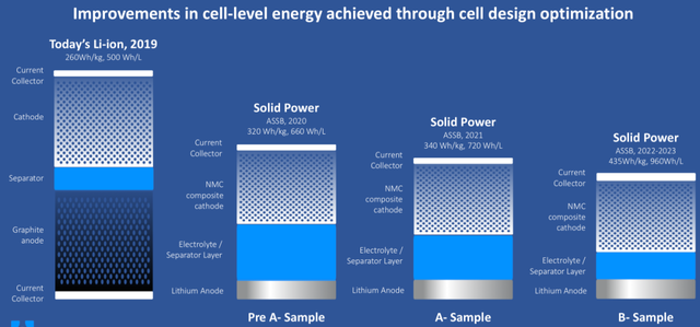 通過減少電解質隔膜的厚度,從50微米降低到25微米,提高三元材料在正極的占比,Solid Power計劃在2022年-2023年使得能量密度達到470Wh/kg(質量)和1000 Wh/L(體積)的目標。