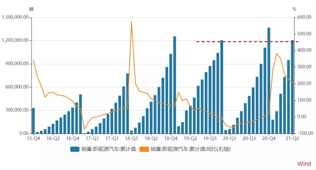 今年1-6月我國(guó)新能源汽車(chē)產(chǎn)銷(xiāo)分別完成121.5萬(wàn)輛和120.6萬(wàn)輛,同比均增長(zhǎng)2倍,上半年的累計(jì)銷(xiāo)量已與2019年全年水平持平,到7月底累計(jì)銷(xiāo)量有望超過(guò)2020年全年的銷(xiāo)量。