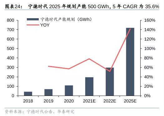 根據(jù)龍頭披露的產(chǎn)能規(guī)劃,寧德時(shí)代2025年規(guī)劃產(chǎn)能為500GWh;國(guó)軒高科計(jì)劃2025年將產(chǎn)能升至100GWh;LG化學(xué)擬到2023年將電池產(chǎn)能擴(kuò)大至250GWh,SKI計(jì)劃到2025年將電池產(chǎn)能提升至200GWh。
