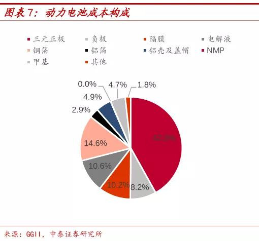 在動(dòng)力電池的成本構(gòu)成中,正極材料、負(fù)極材料、電解液和隔膜四大材料的占比較大,其中正極材料占比約40%,其余三項(xiàng)成本占比在10%左右。
